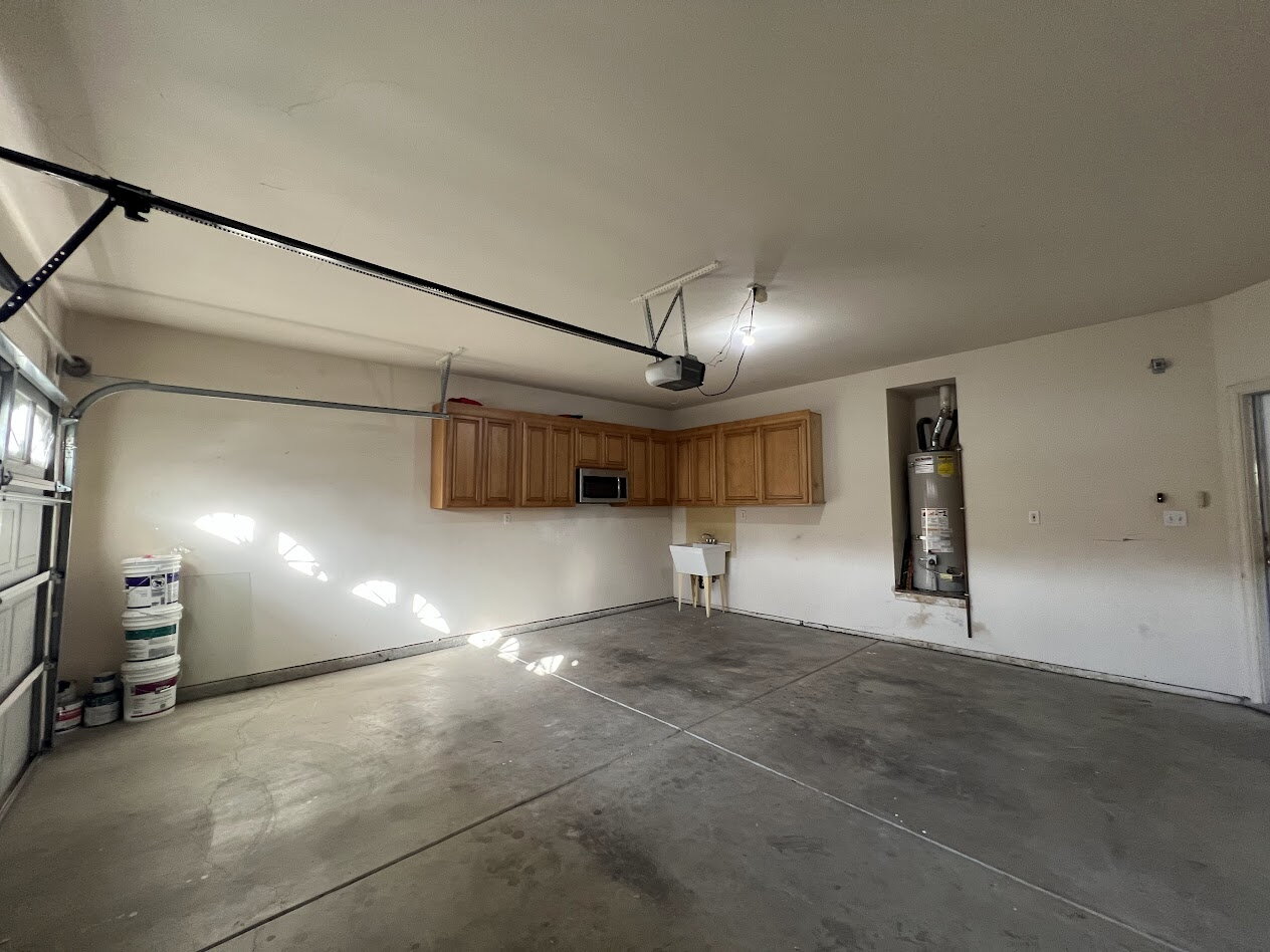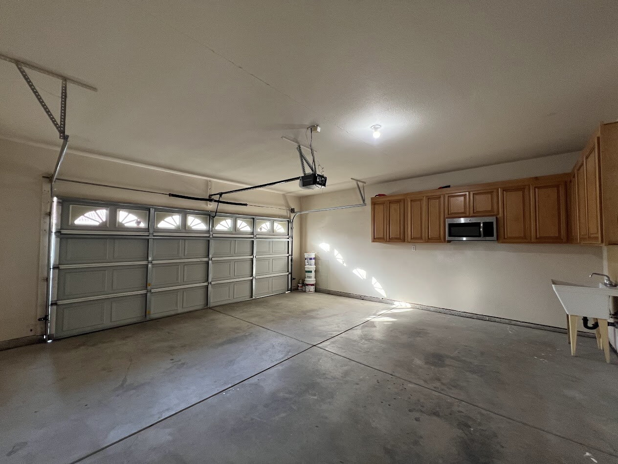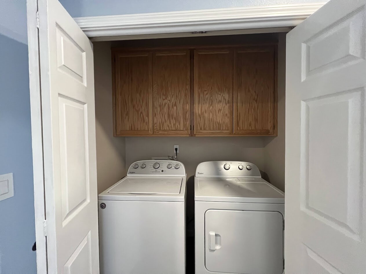 The kitchen features newer appliances, an electric stove, built-in microwave, and dishwasher, making meal prep a breeze. A washer and dryer are conveniently included inside the home, along with extra cabinet storage space located in the garage for added organization.